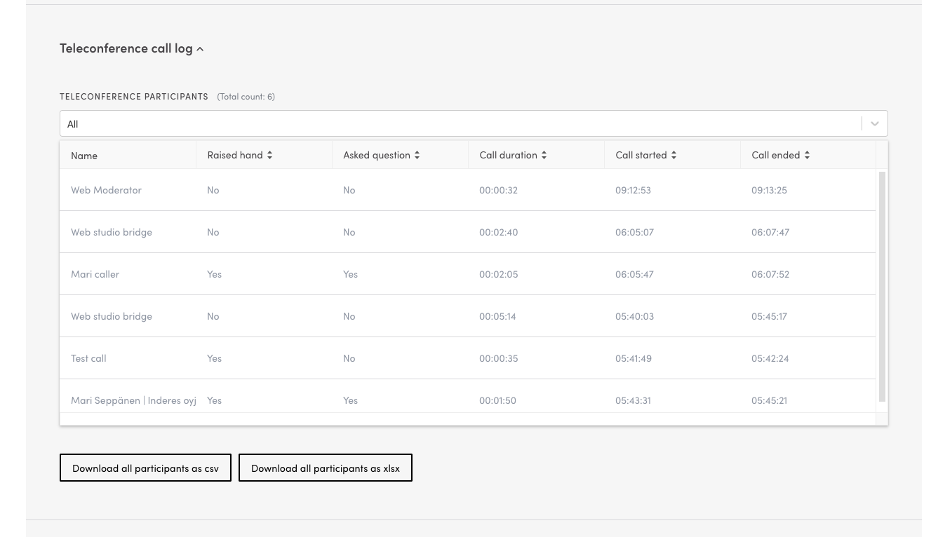 This section shows the registered participants. You can filter this list or add columns that are not shown by default which is often quite useful. For example, you can find the registered Telco participants in Analytics Dashboard under “Registered participants” if you enable “Teleconference” row as in the picture.