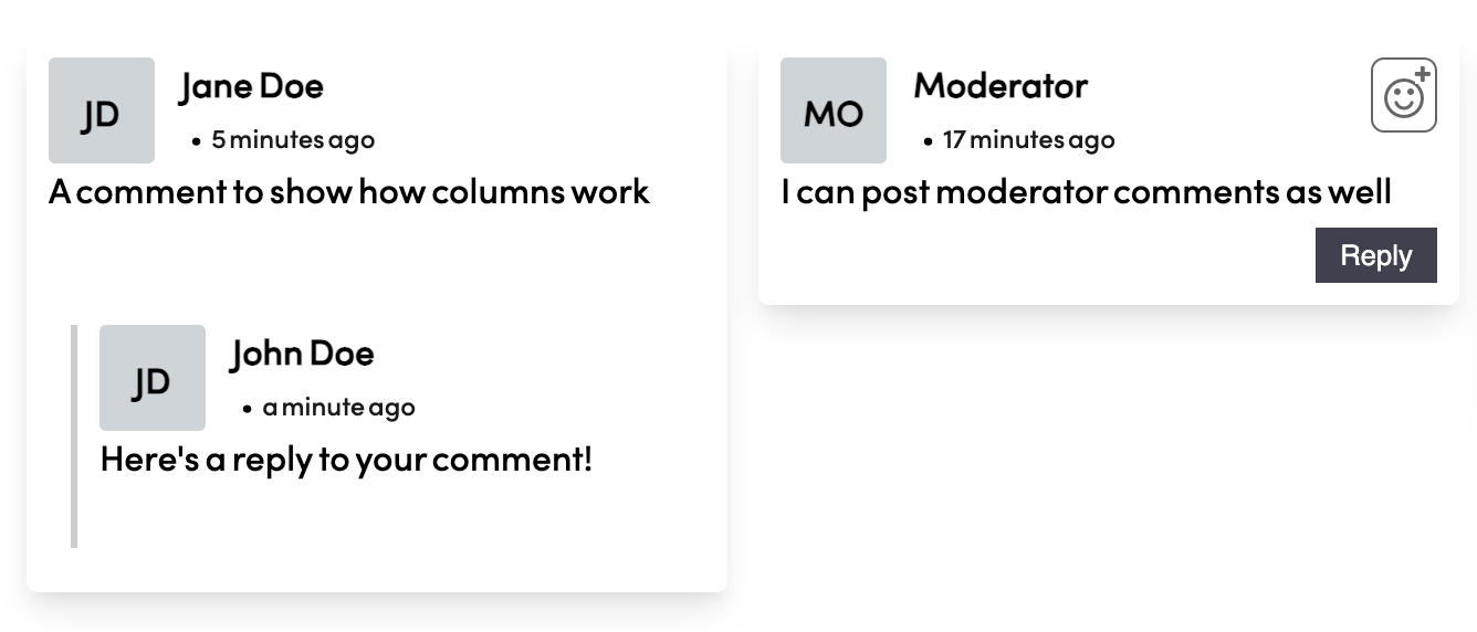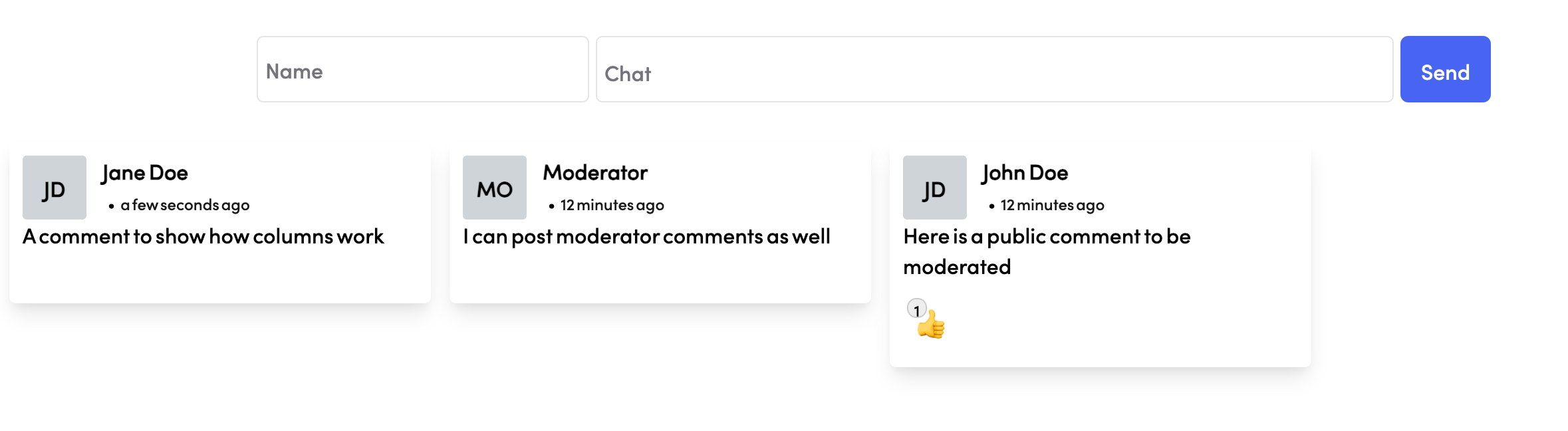 Enable this feature to have messages next to each other as a chat wall (left image) instead of a linear chat stream (right image). This way you can ensure a compact event site.