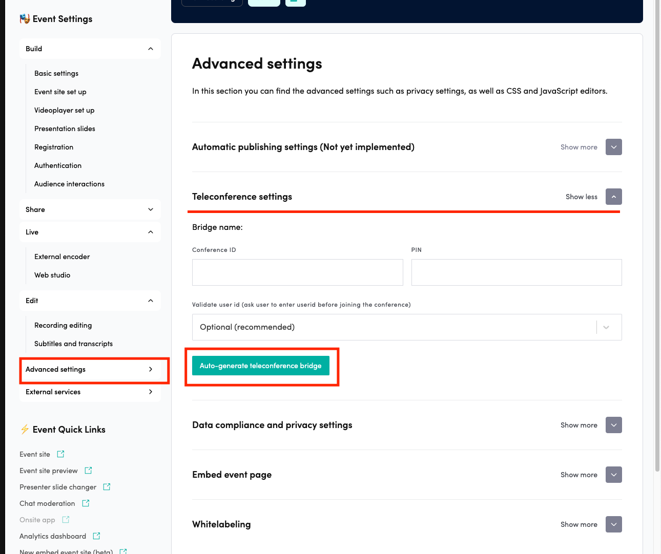 Without a web studio, you can create a teleconference by going to Advanced Settings -> Teleconference Settings and auto-generating a teleconference bridge.