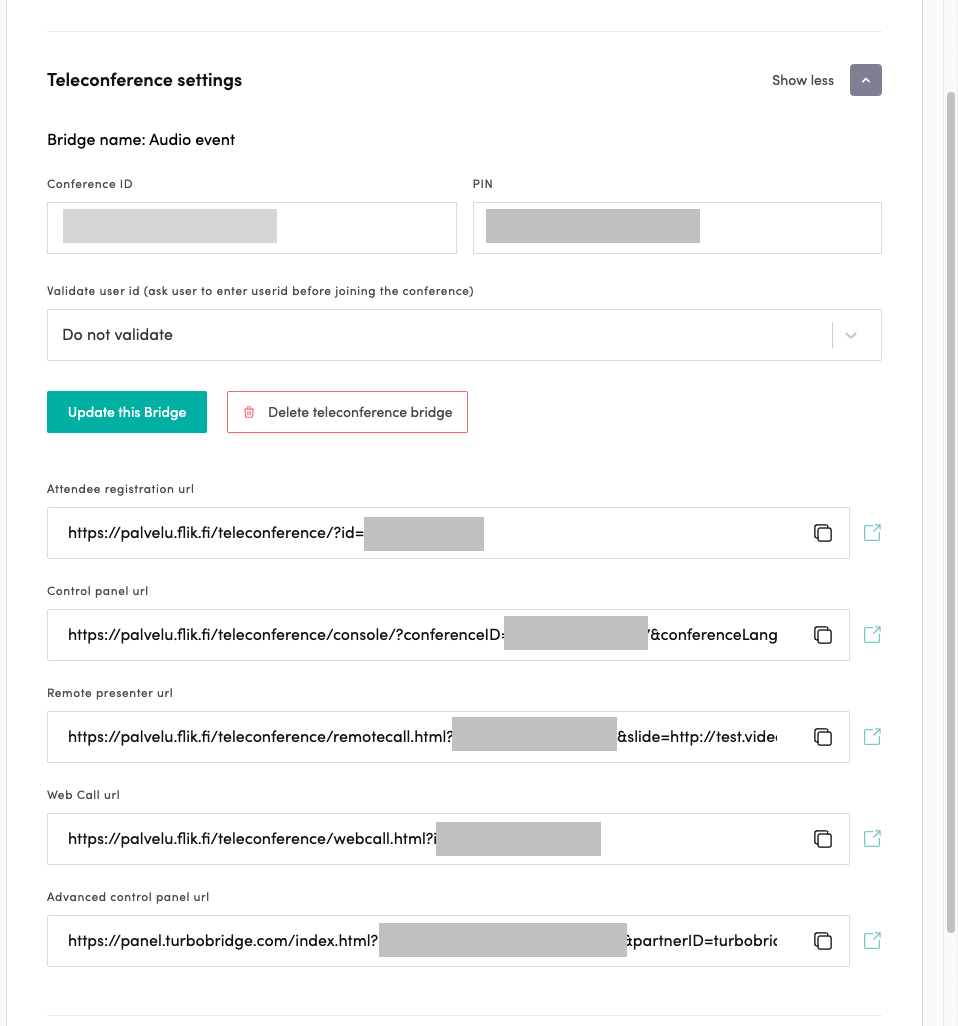 The Attendee Registration URL (new) is the link where users can register for the teleconference.