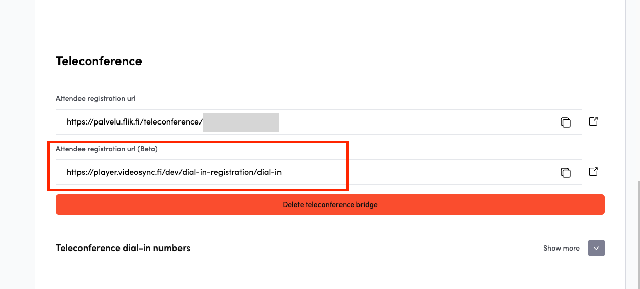 We have created a new Attendee Registration URL where participants can register for the teleconference. The new link can be found under Web Studio -> Teleconference as Attendee Registration URL Or Advanced Settings -> Teleconference Settings -> Attendee Registration URL..