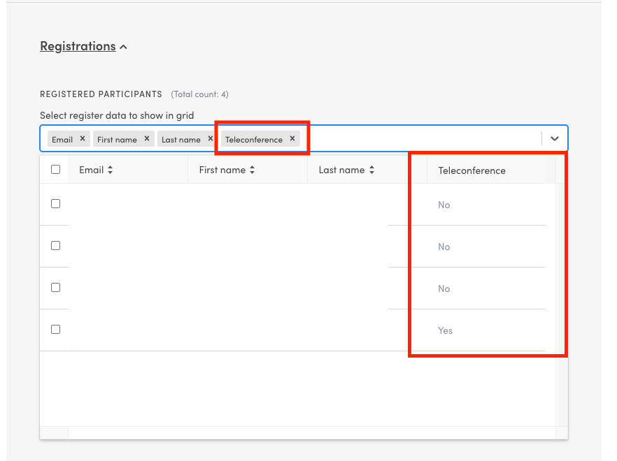 Users registered through the new dial-in site also appear in the Videosync dashboard in the registration table, where they can be distinguished from the teleconference data.
