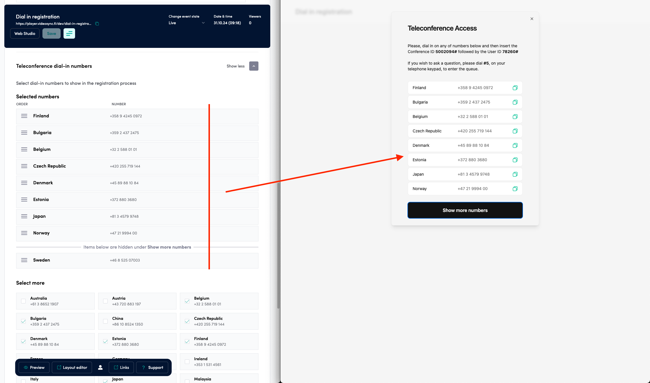 Below this section, you will also find options to organize, delete, and add teleconference numbers. These numbers will appear on the new /dial-in page and will be sent to participants’ emails when they register for the teleconference and have provided their email addresses.